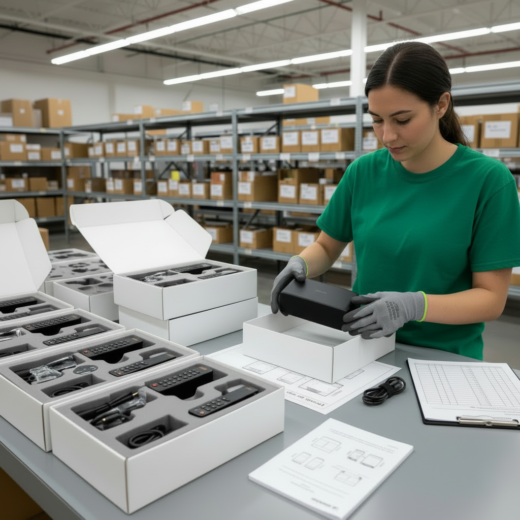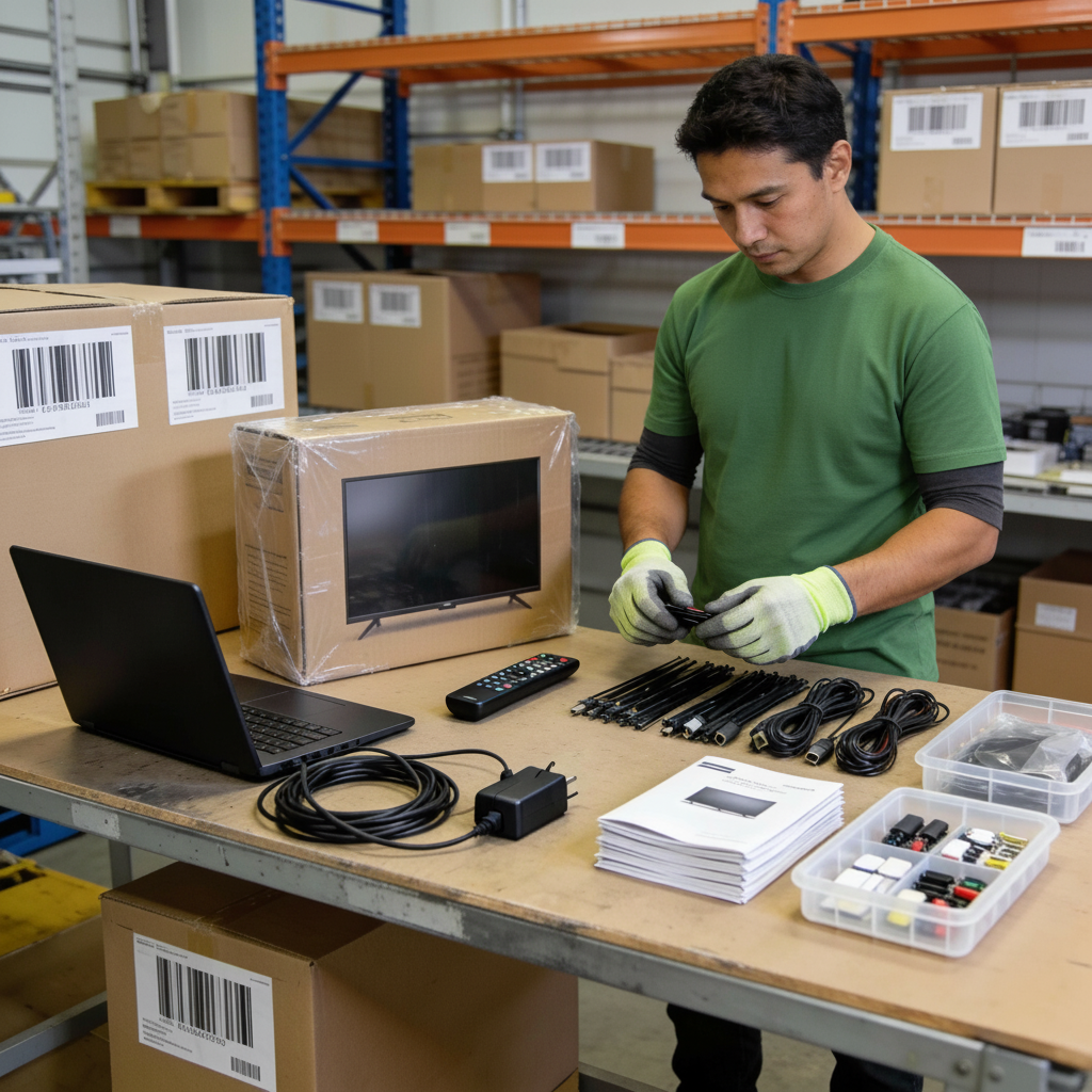 Cables, remotes, manuals, or other required components are matched to products before packing or storage.